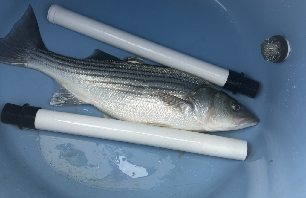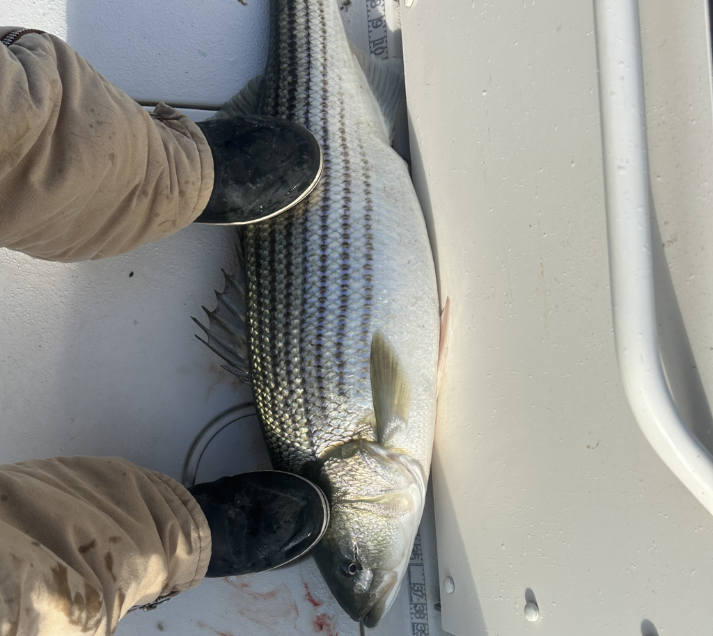 I started in shallow water just south of the Smith Point Lighthouse, around 30 feet deep. That was a complete bust. If there were any fish there, they were hiding well. Still south of the lighthouse, near the channel in about 50 feet of water, I finally found what I was looking for: a bunch of marks on the bottom. Judging by the size of the marks, these were big fish. I circled back and hooked a beautiful 39-inch striper on my trusty chartreuse rig. After that, I picked up a few more in the 22- to 23-inch range, but I still wanted another solid spot.